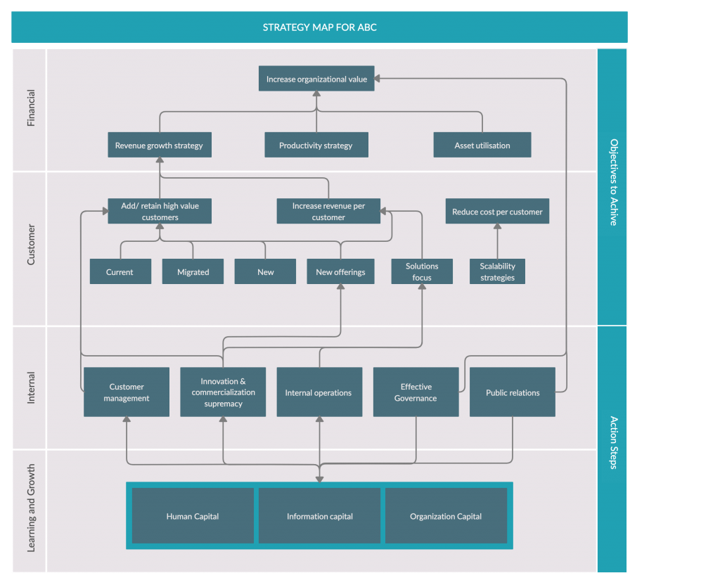 حسنًا في هذه الحالة ، فإن استخدام خريطة الإستراتيجية هو أفضل شيء يمكنك القيام به ، لأنه سيزيل كل الفوضى وعمليات المعالجة الزائدة ، تاركًا فقط المكونات الأساسية لاستراتيجية نمو عملك ، مما يسمح لك برؤية في الوقت الحقيقي من النقطة أ إلى النقطة ب جميع أنشطة مؤسستك.